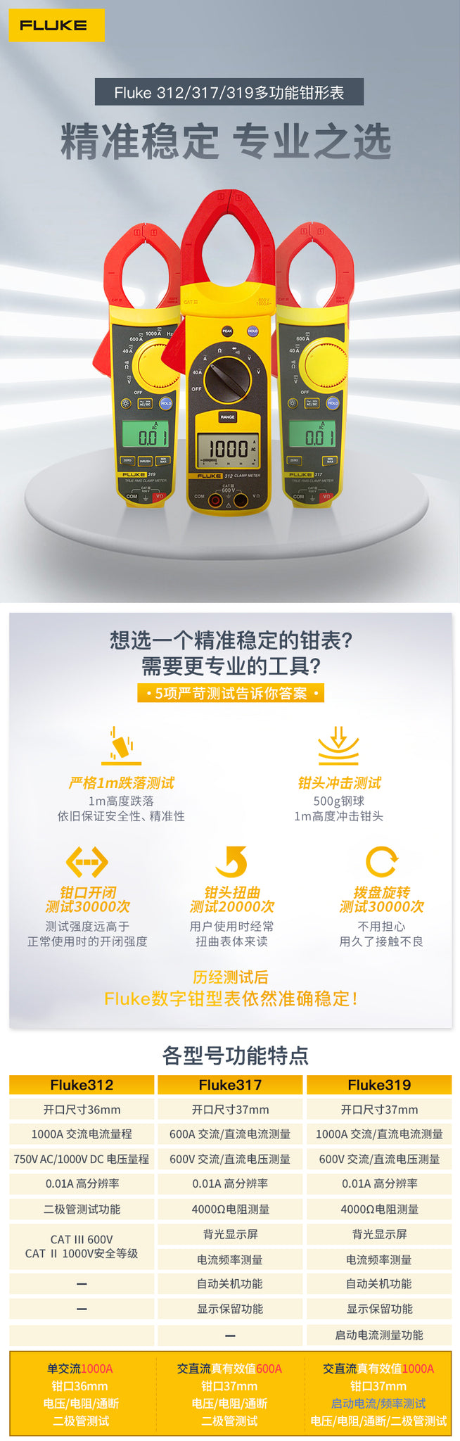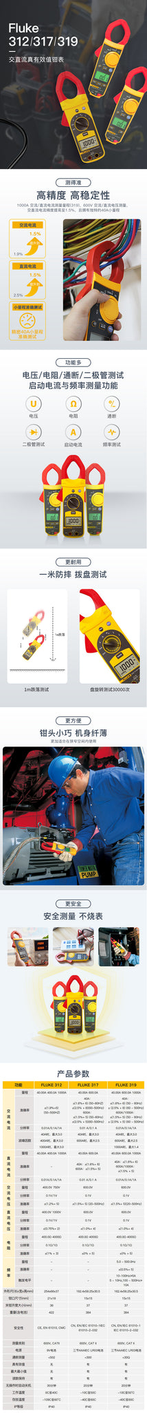 Fluke 317/319真有效值交直流数字钳型表具有符合人体工程学的设计,它流线型的外型更方便握在手中。这两款纤薄,坚固的数字式钳型电流表更加适合易于1000A电流测量(319)和在狭窄空间内使用。 317和319拥有准确的40 A小量程。 FLUKE 319数字式钳形电流表除了具备一系列的测试功能,还具备了启动电流和频率功能,方便进行电机和照明等设备的测量。