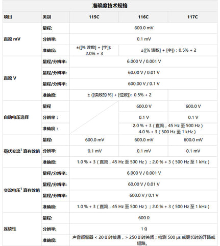 | 交流电压¹真有效值 | 量程/分辨率 | 6.000 V / 0.001 V 60.00 V / 0.01 V 600.0 V / 0.1 V |