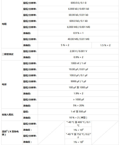 | 欧姆 | 量程/分辨率 | 600.0 Ω / 0.1 Ω 6.000 kΩ / 0.001 kΩ 60.00 kΩ / 0.01 kΩ 600.0 kΩ / 0.1 kΩ 6.000 MΩ / 0.001 MΩ |