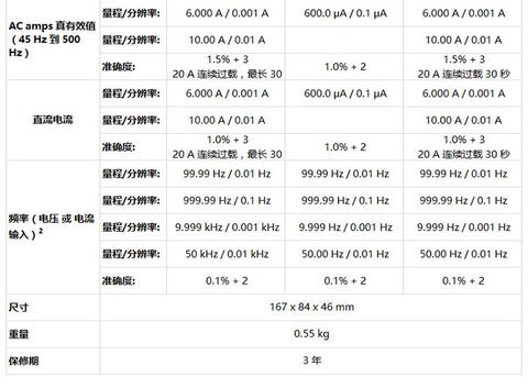 | 直流安培 | 量程/分辨率 | 6.000 A / 0.001 A 10.00 A / 0.01 A |