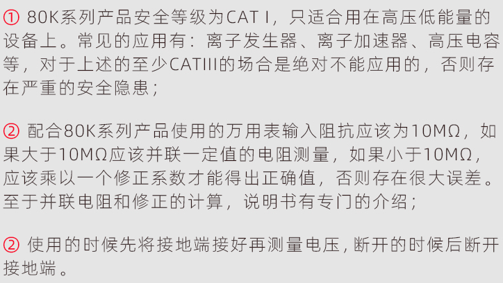 80K高压探棒 是为检测高电压而设计的, 80K高压探头只能用于有限的测量电路设备。不可使用这个探针测量高电压配电系统。建议在使用高压探棒时候使用有10兆欧输入阻抗的万用表,1000:1的分压比输出。